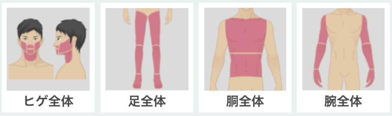 セットの選べる脱毛部位は、「ヒゲ全体脱毛」「足全体脱毛」「胴全体脱毛」「腕全体脱毛」の4種類。