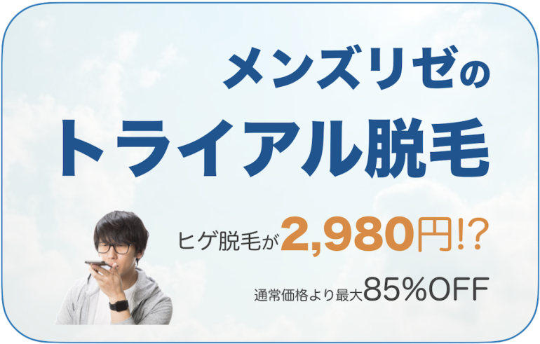 メンズリゼのトライアル脱毛とは、男性に人気の部位を1回1部位2,980円で体験できる脱毛。最大85%offで試すことができます。