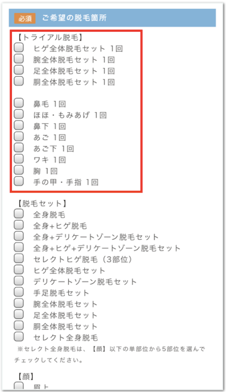 予約フォームに希望部位をチェックする項目があり、そこで【トライアル脱毛の部位】を選びます。