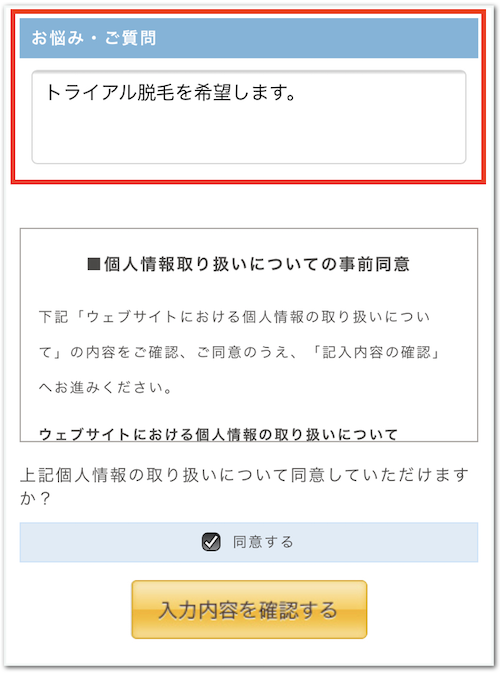 それに加えて【お悩み・ご質問】という項目に「トライアル脱毛を希望」と入力しておきましょう。